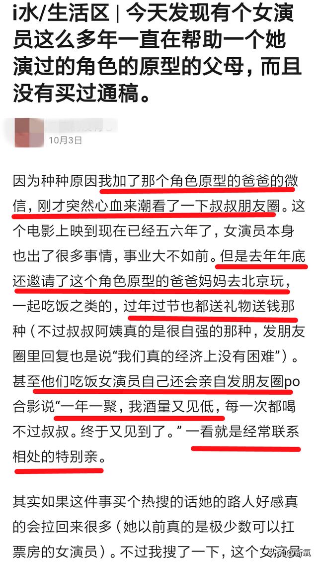 有个女演员多年一直在帮助一个她演过的角色原型的父母,而且从来没有那这事来炒作自己。这件事还是网友无意间加了角色原型的父亲,看了他的朋友圈才知道的。