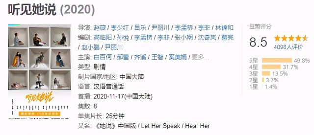 《听见她说》一上线,豆瓣评分8.5,真是一个不错的分数。女性观众对该节目很看好,甚至是清一色的好评,因为代入感强的角色,加上演员精湛的台词功底,把社会中的弊端展示的很客观很全面。相反,男性观众就不那么友好了,觉得是过度消费女性的焦虑,把部分女性推向深渊。