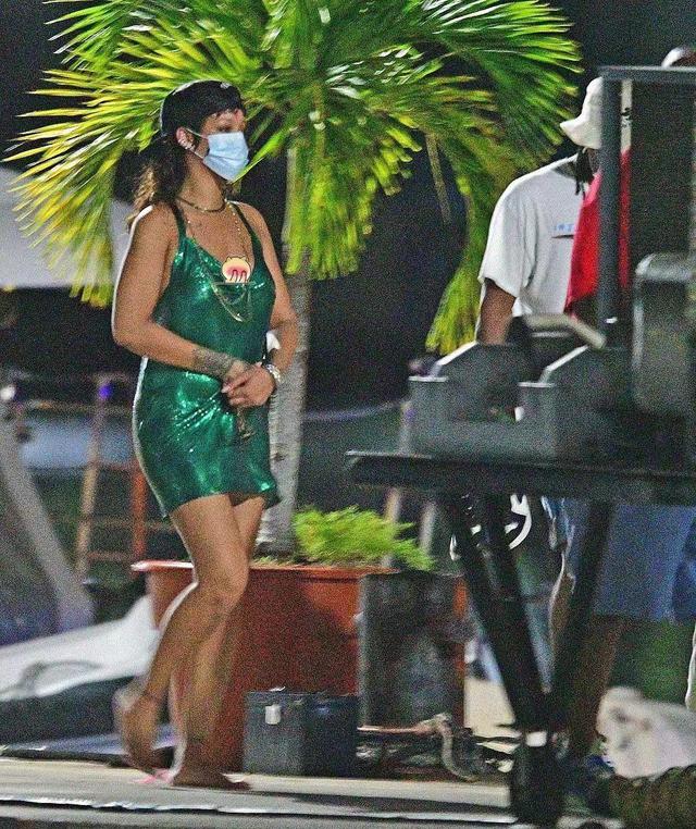 沉浸在恋爱中的蕾哈娜当天也是打扮的十分靓丽。只见她单穿了一身深绿色吊带裙出现在了镜头中,满身的细闪将他衬托的闪闪动人,蕾哈娜无疑成为了游艇上最亮眼的存在。